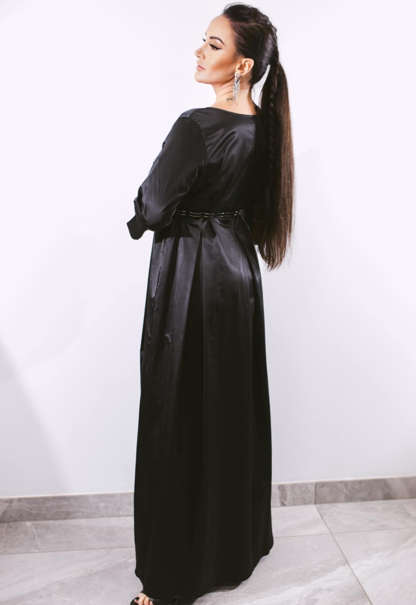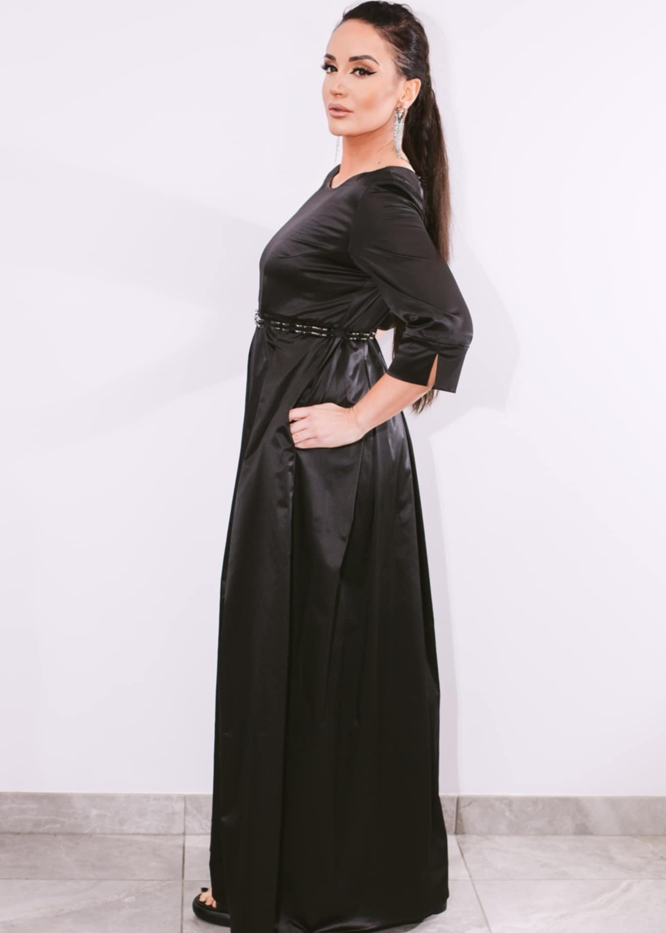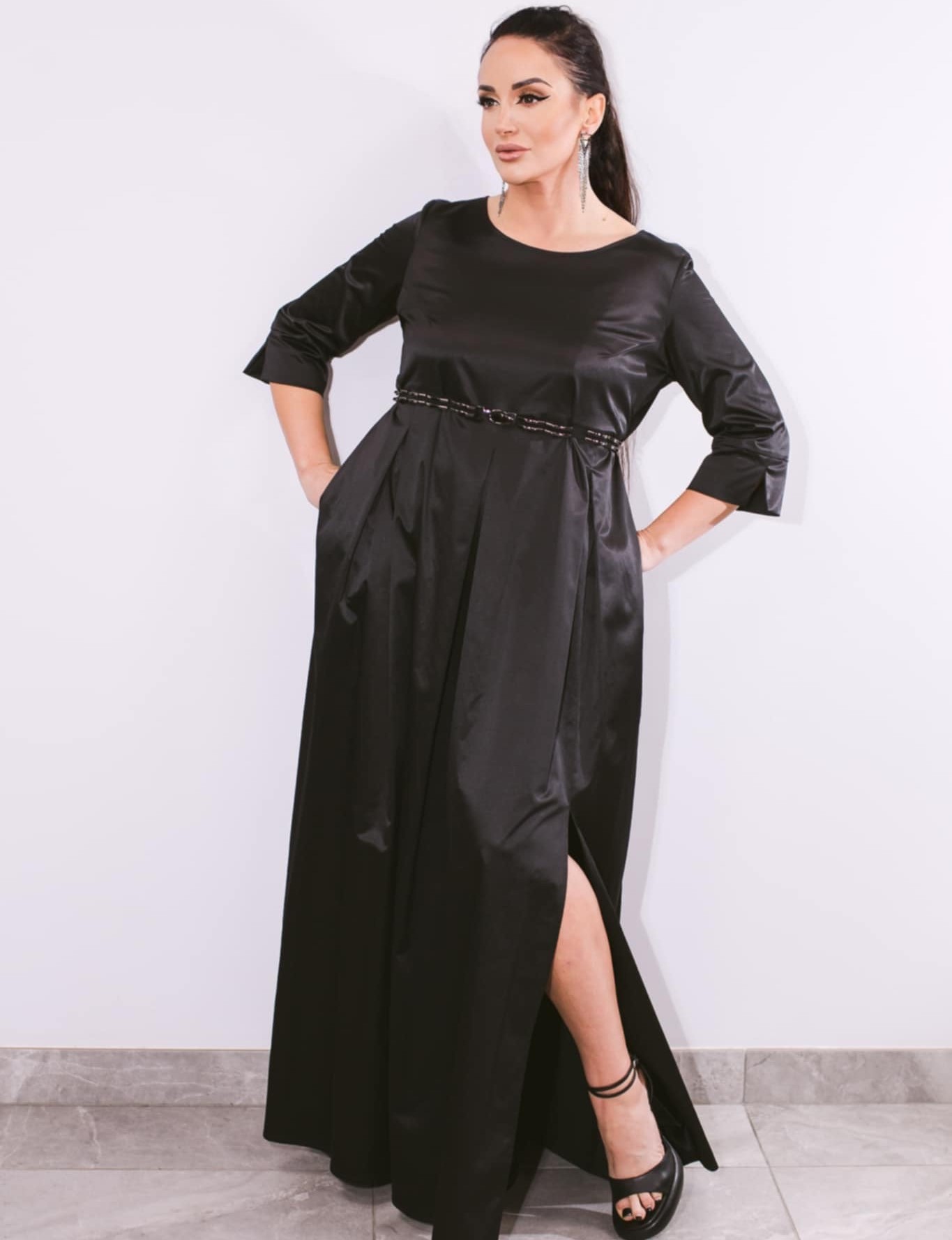 Atlaso suknelė moterims 3/4 rankovėmis, ilga, su kišenėmis ir skeltuku šone.