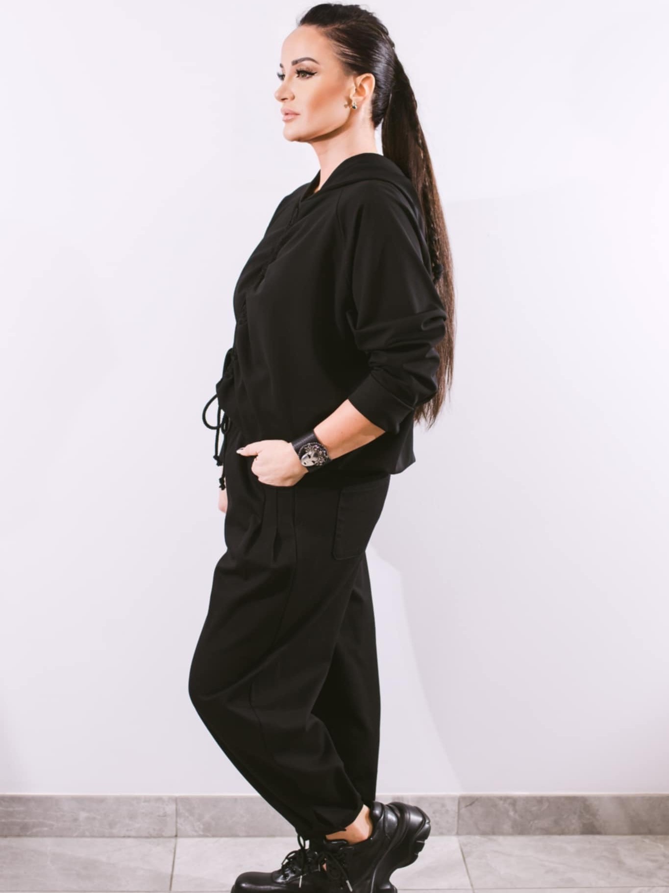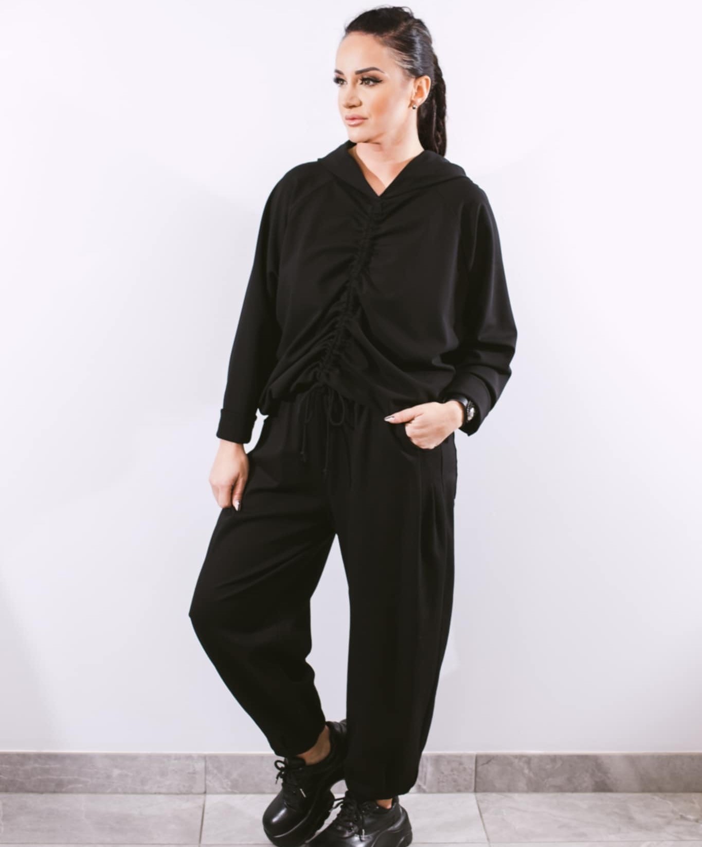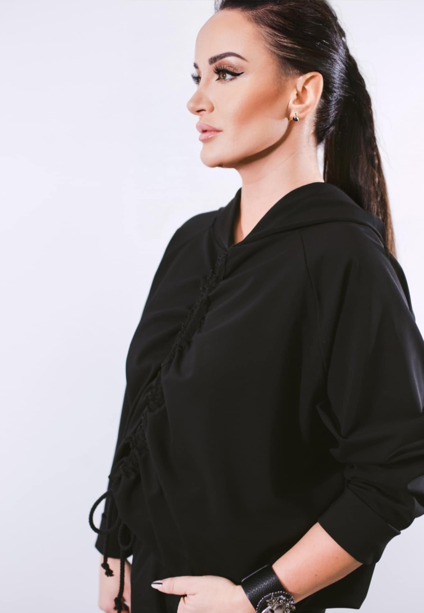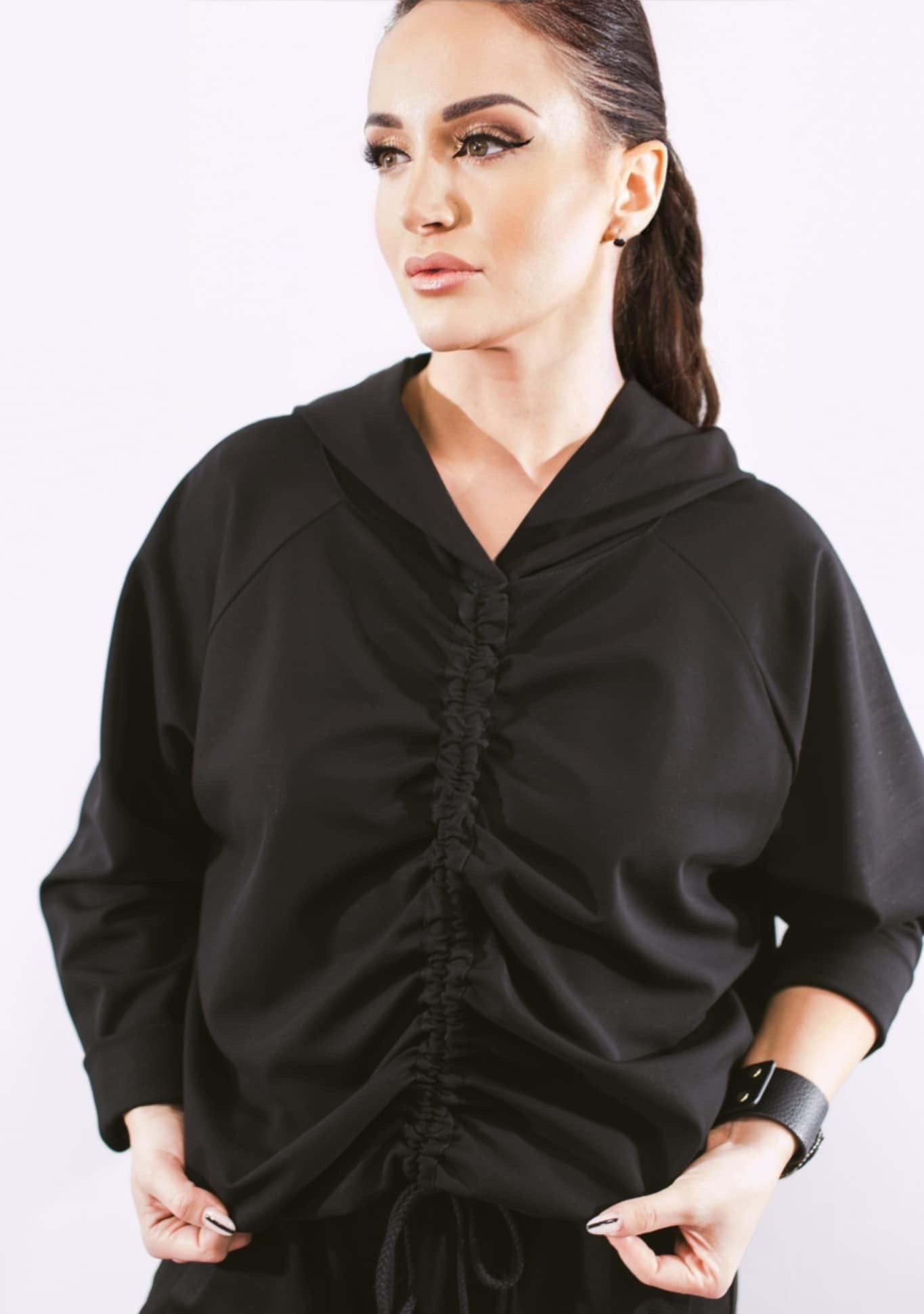 Išskirtinio modelio džemperis moterims su gobtuvu, kurį priekyje galima sutraukti.