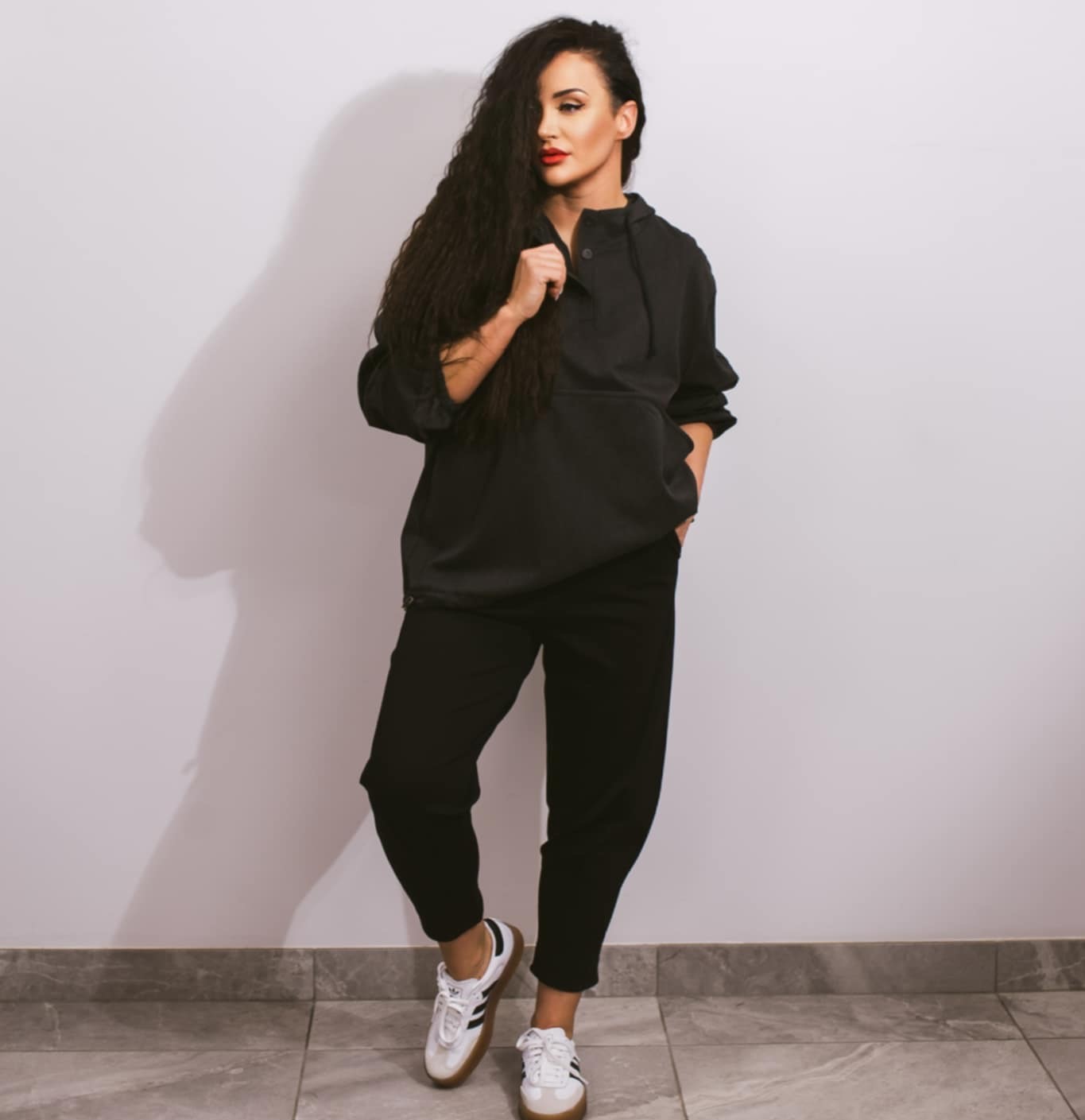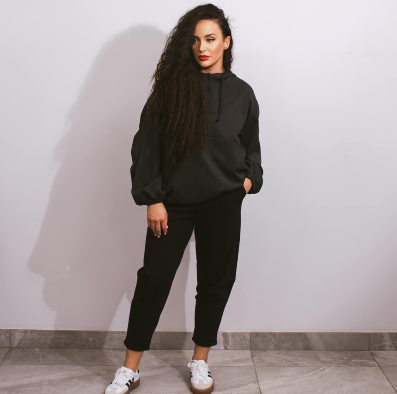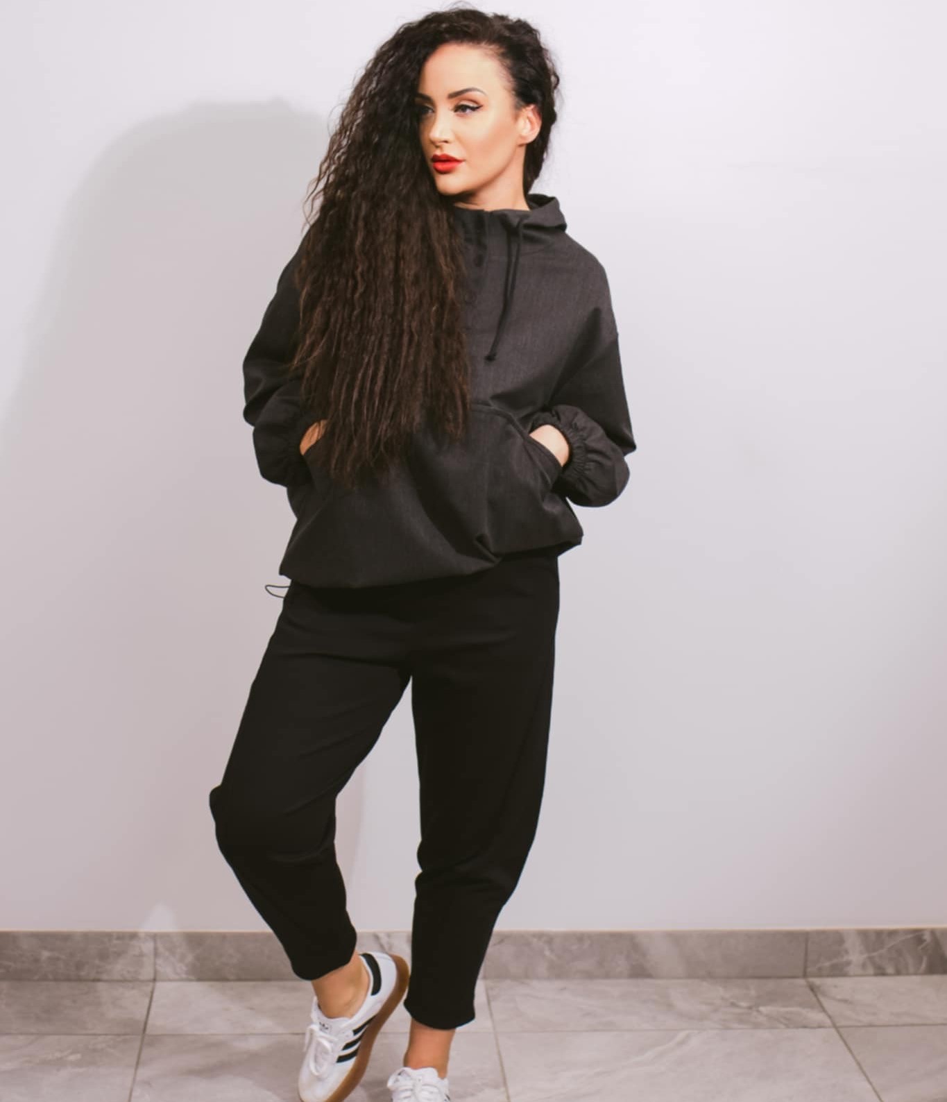 Patogus ir komfortiškas džemperis moterims su gobtuvu, turintis bendrą kišenę priekyje, sagas ties kaklu. Rankogaliai su guma.