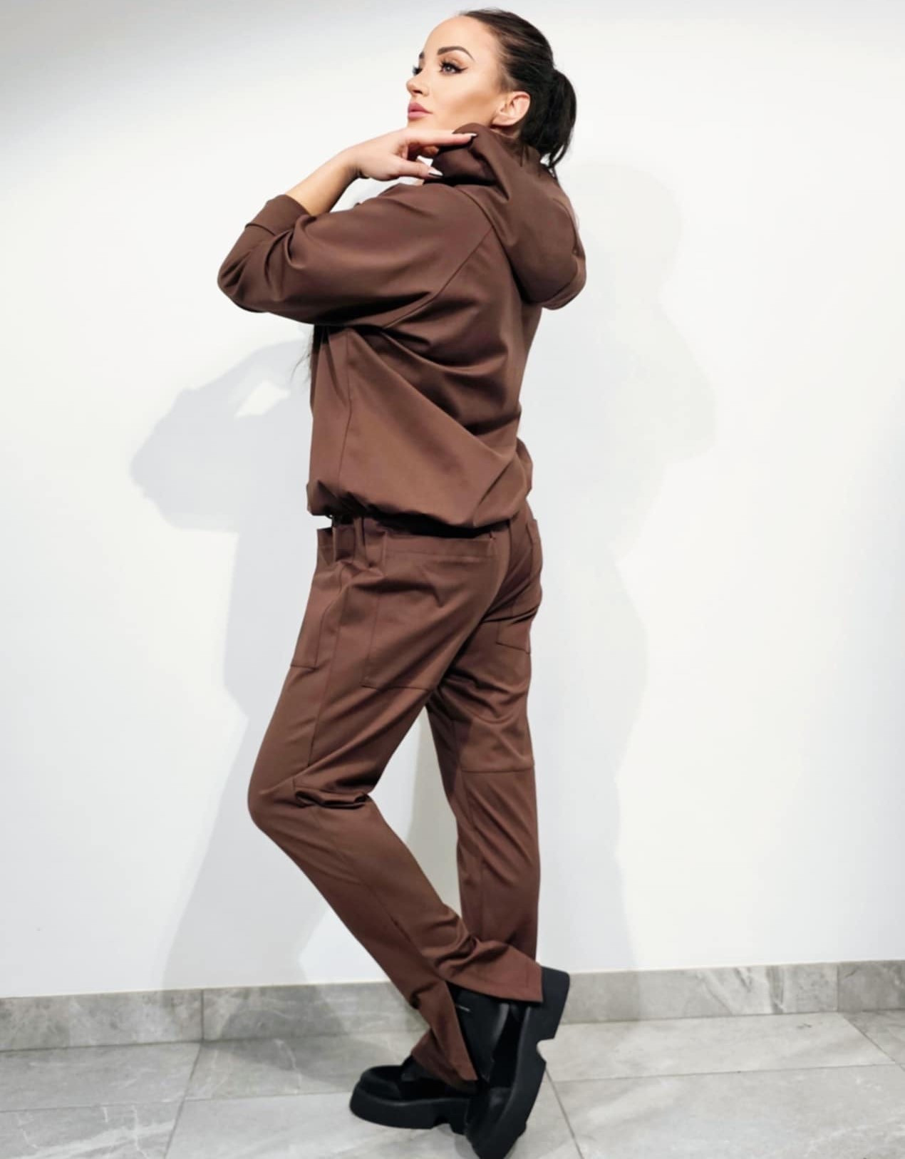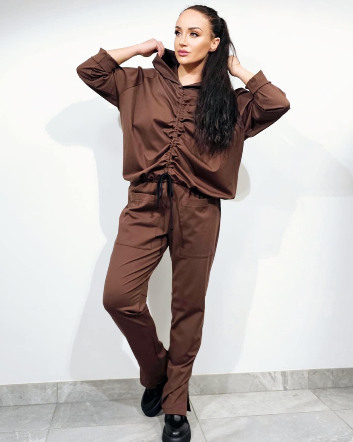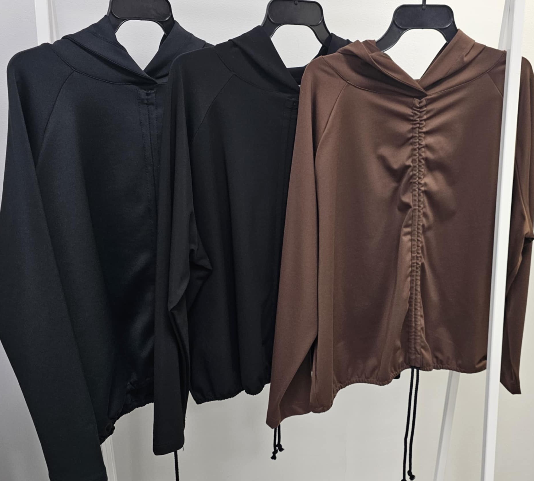Išskirtinio modelio džemperis moterims su gobtuvu, kurį priekyje galima sutraukti.