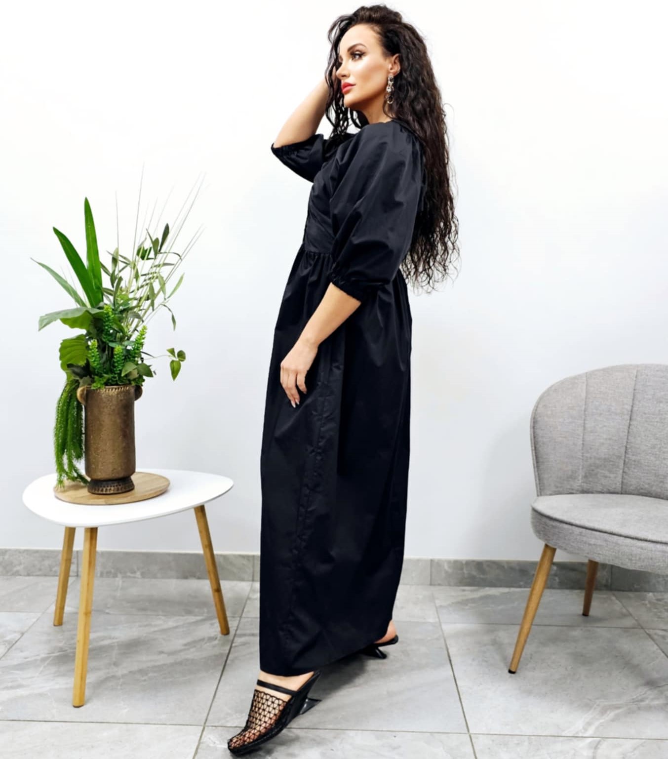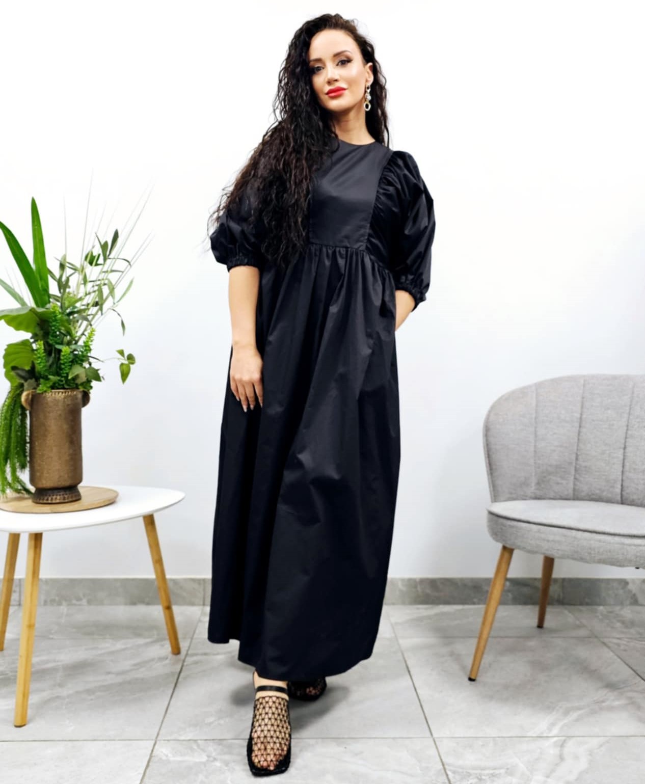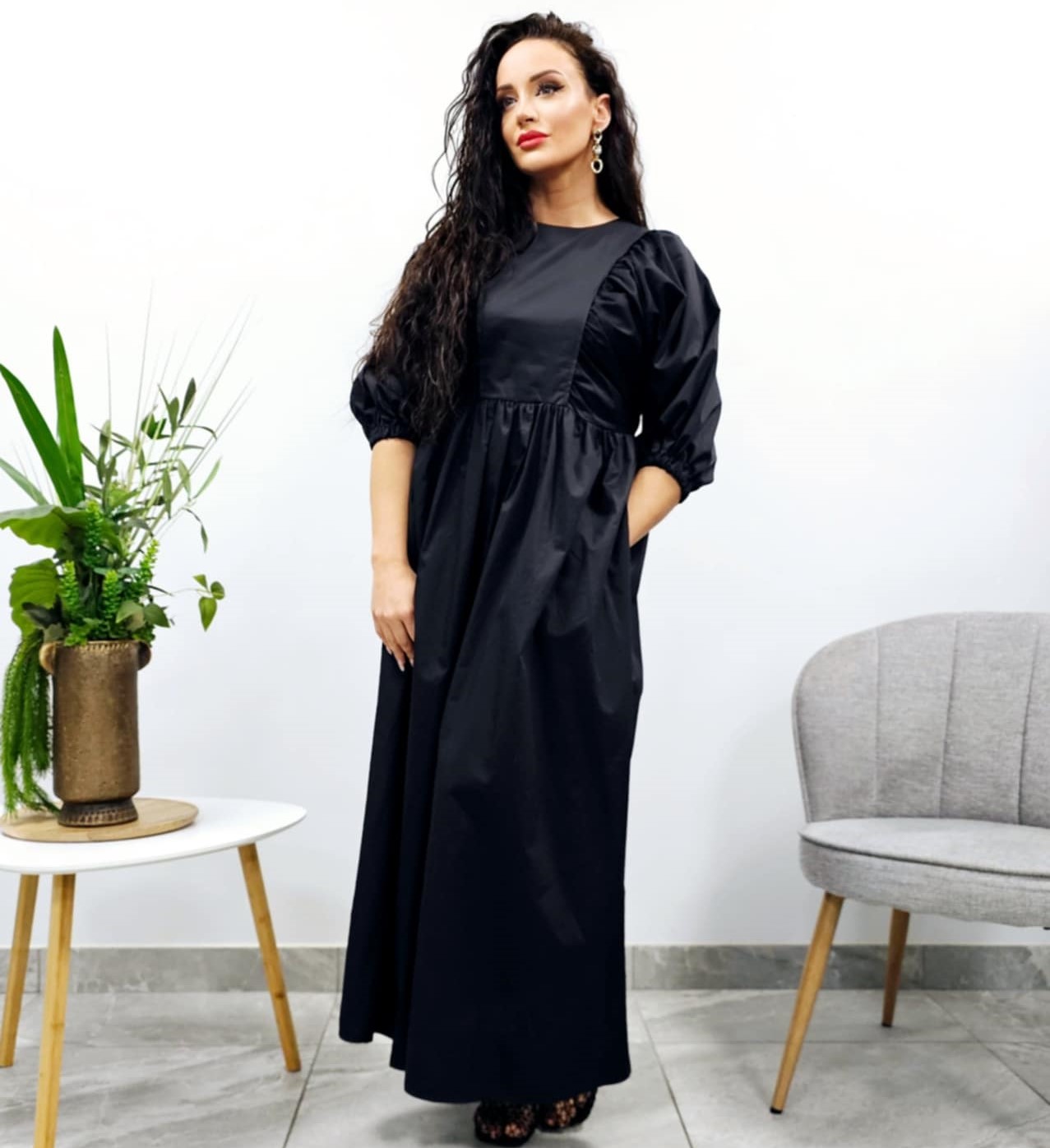 Ši stilinga juoda ilga suknelė išsiskiria pūstomis rankovėmis ir klostuotu siluetu, suteikiančiu lengvumo bei elegancijos. Taip pat yra kišenės šonuose.