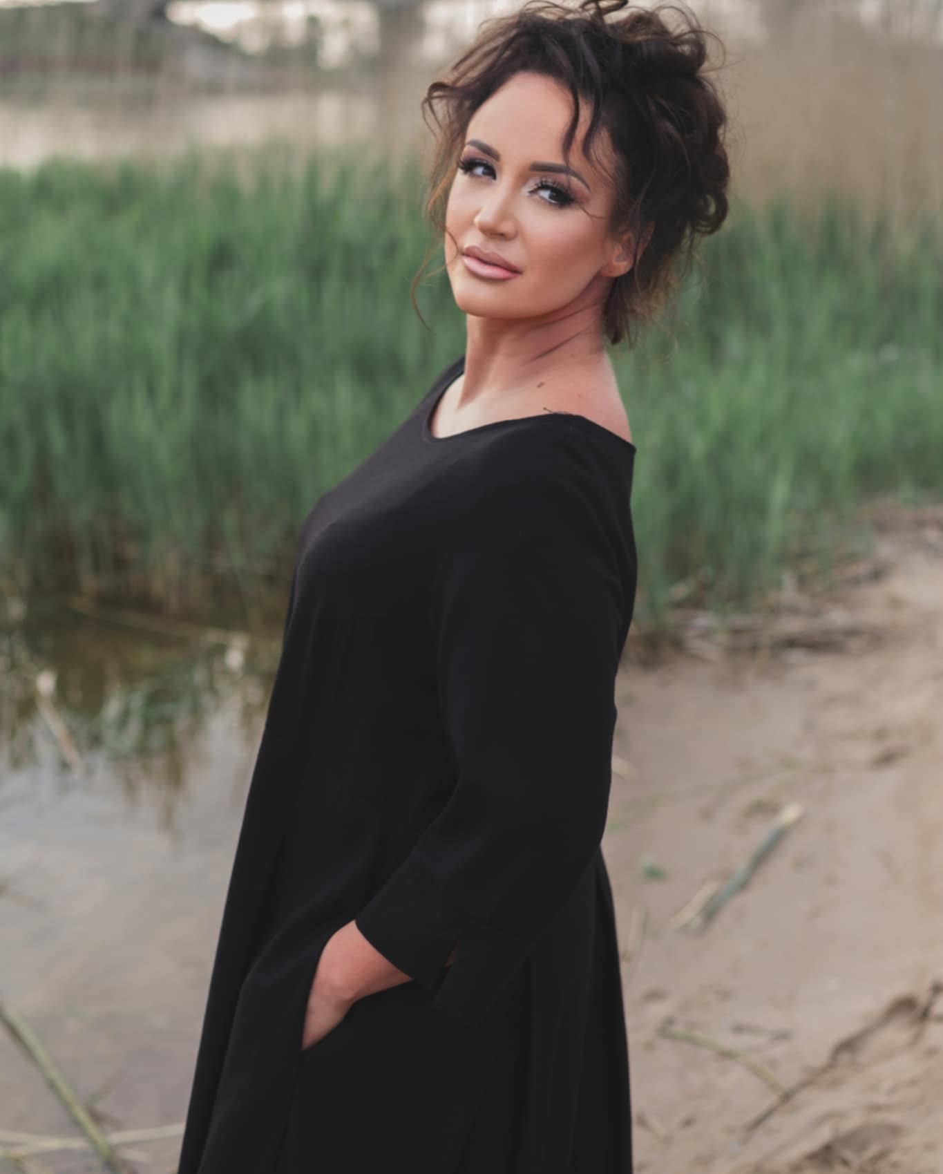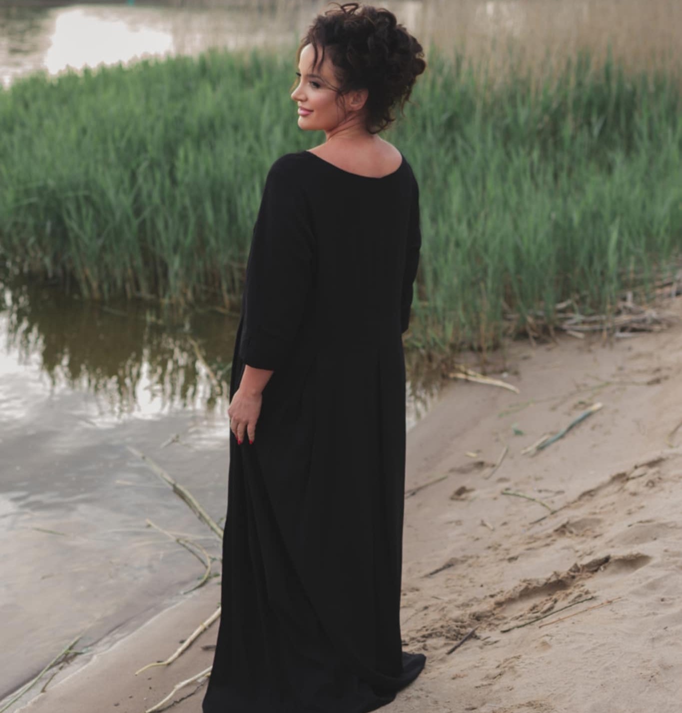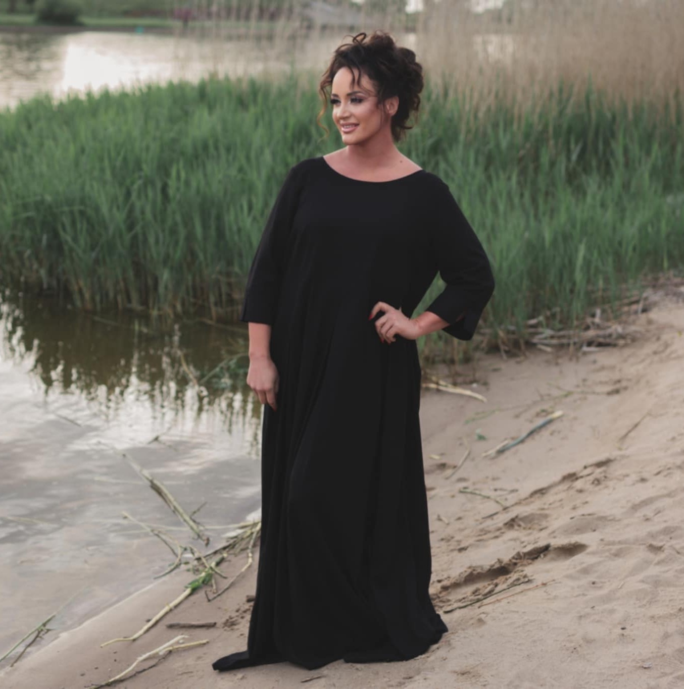 Atlaso suknelė moterims 3/4 rankovėmis, ilga, su kišenėmis ir skeltuku šone.