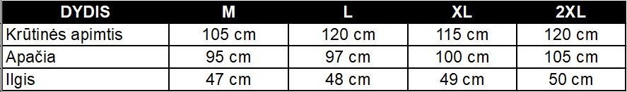 Priežiūra: skalbimas rankiniu būdu iki – 30°C temperatūroje. Nerekomenduojama džiovinti džiovyklėje. Lyginti ne aukštesne negu 110°C temperatūra.