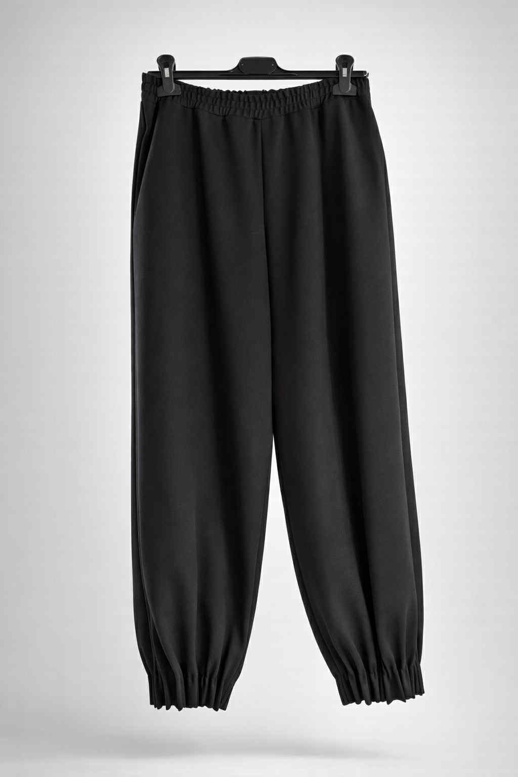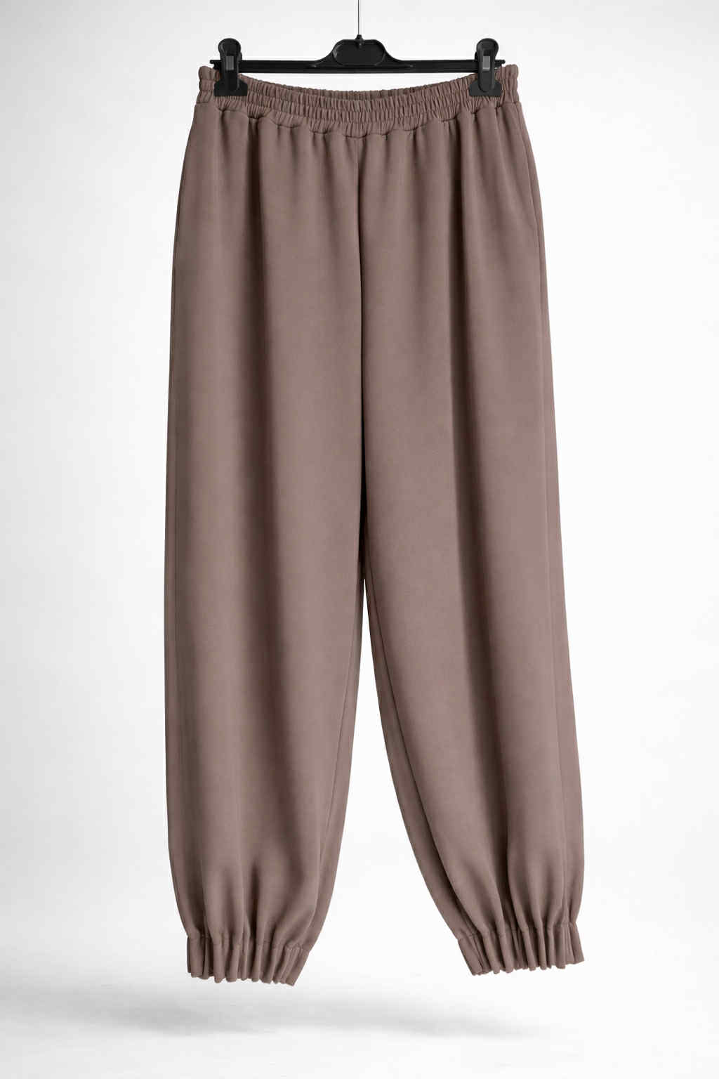 Platesnio modelio kelnės moterims, suraukta apačia ir kišenėmis šonuose.