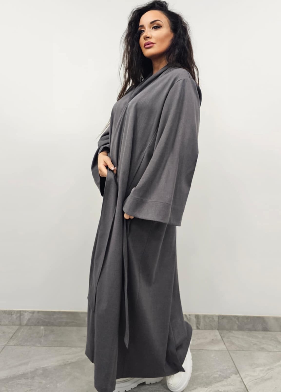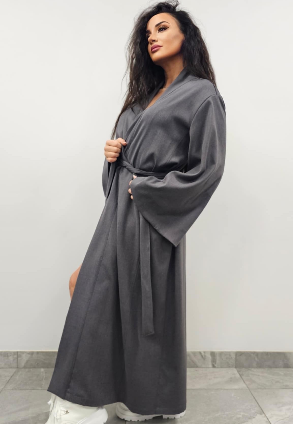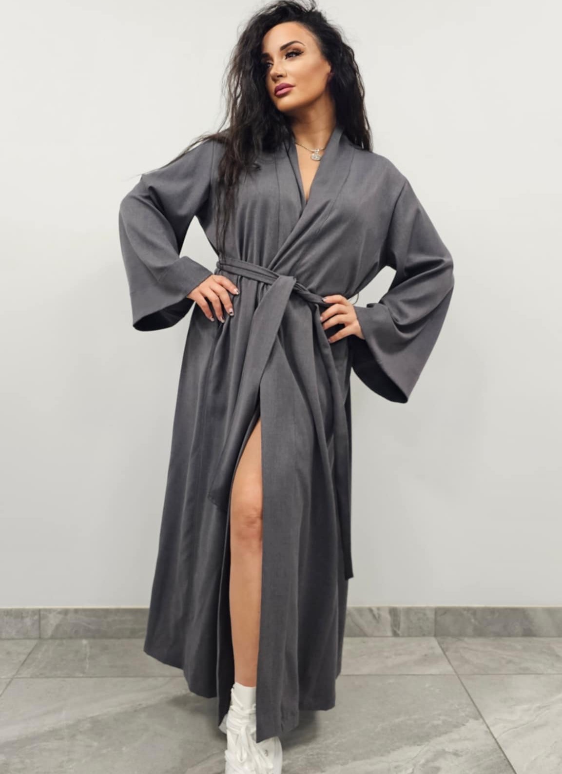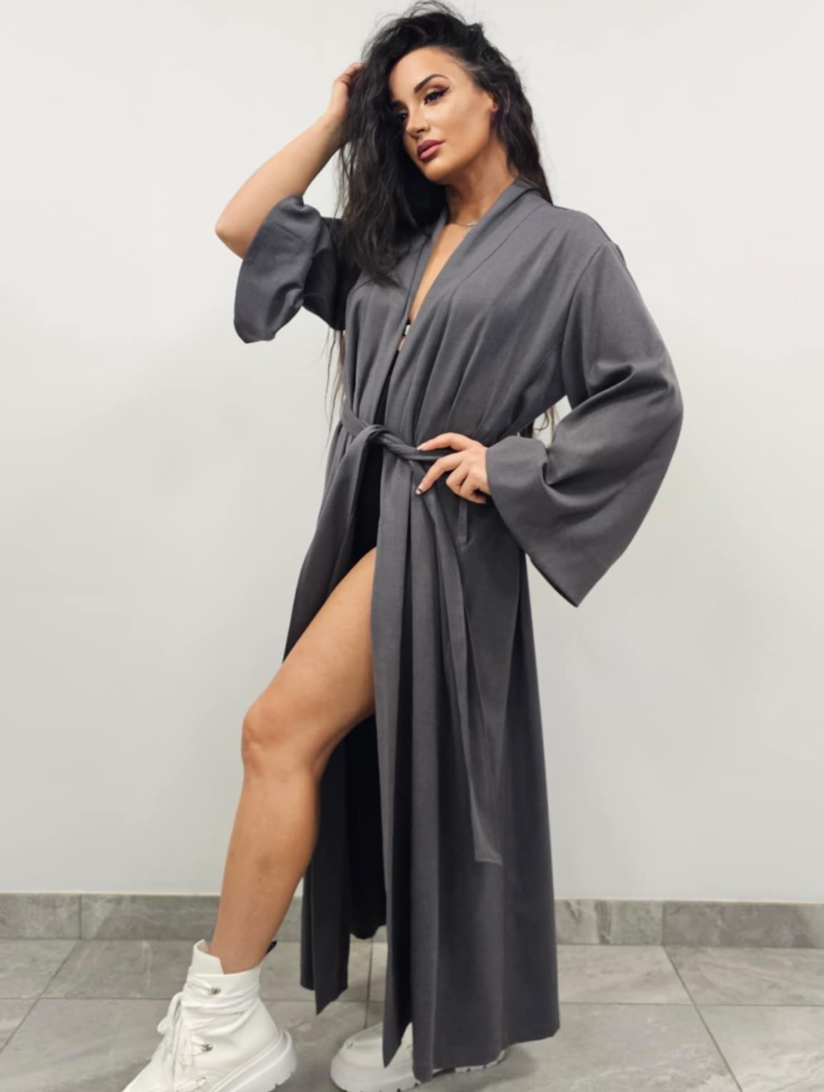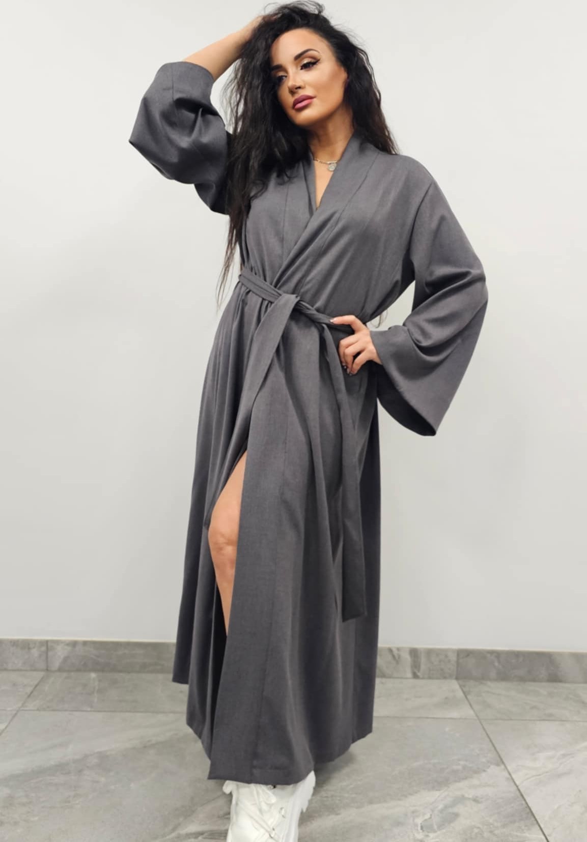 Lengvai krentančio audinio kimono moterims, kurį galima dėvėti kaip švarkelį ar suknelę.